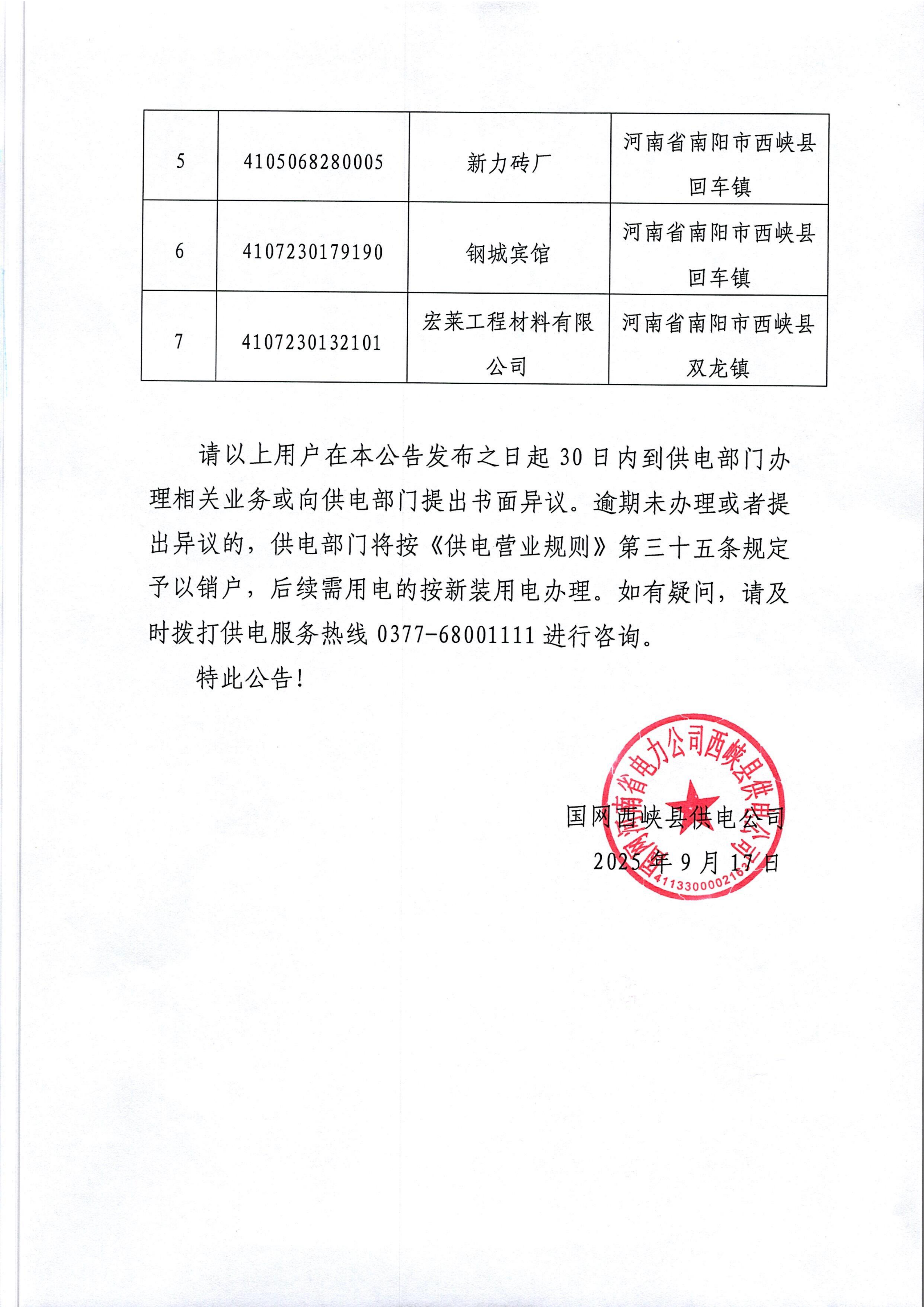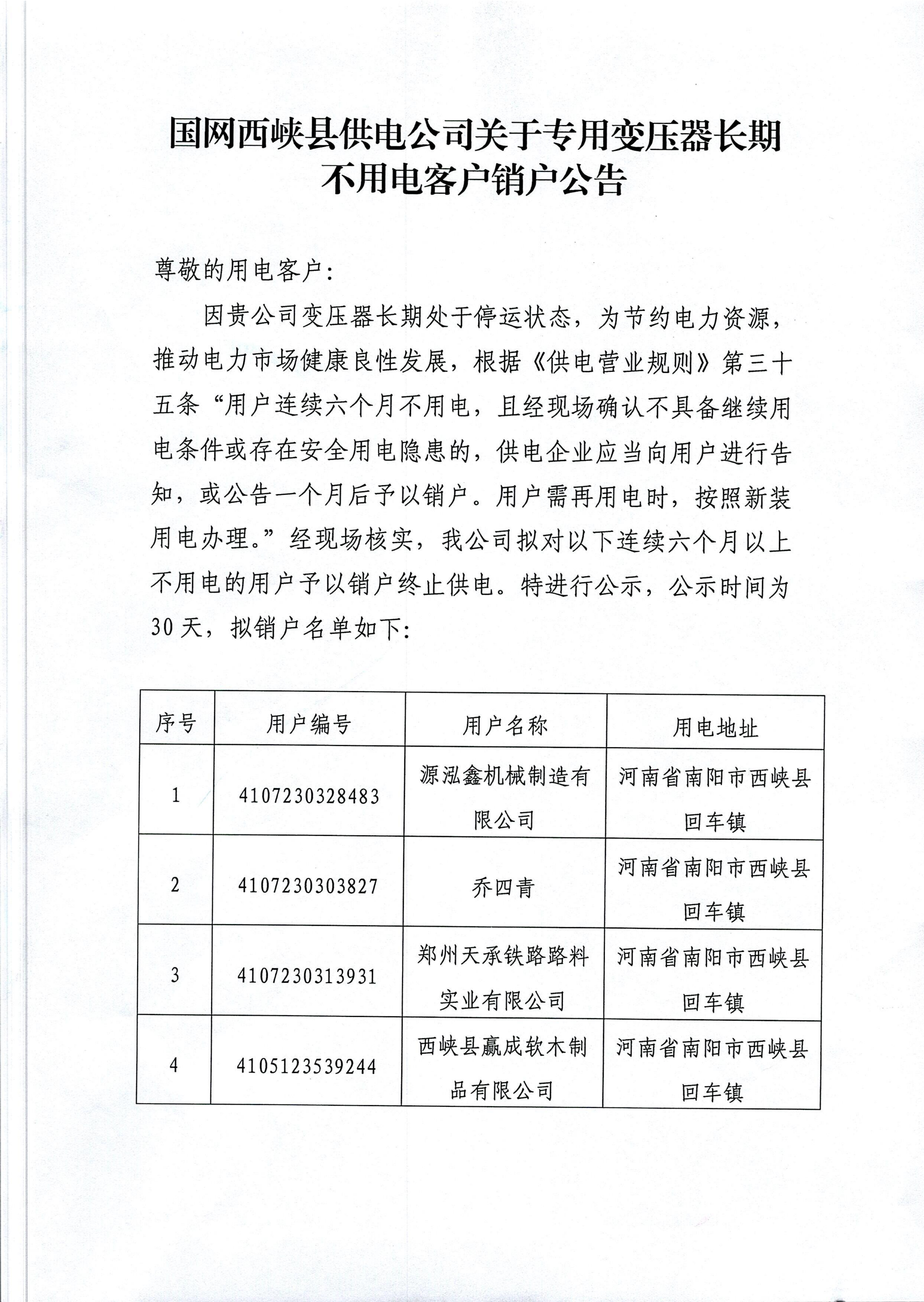 国网西峡县供电公司关于专用变压器长期不用电客户销户公告