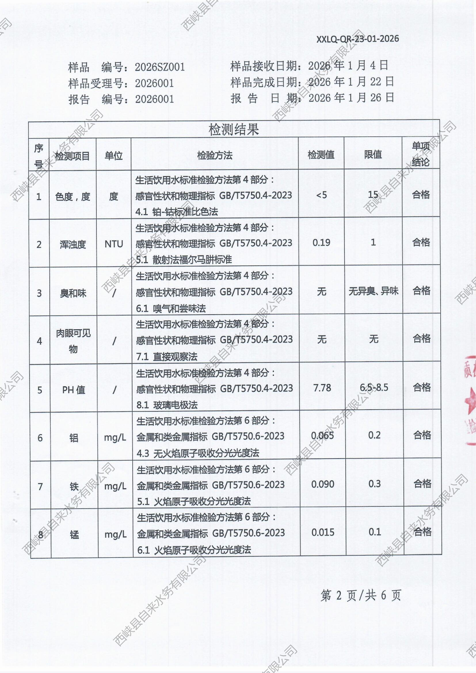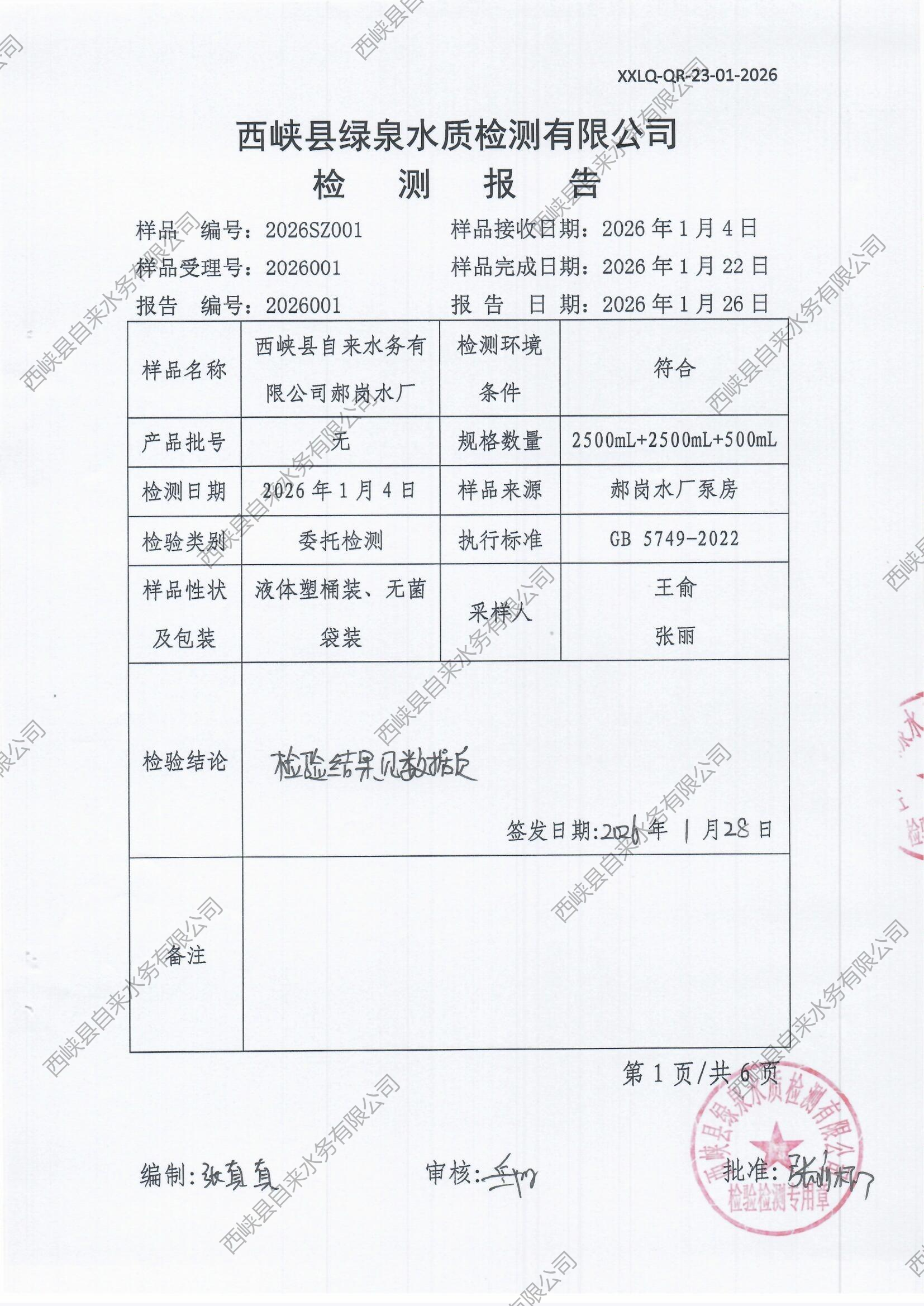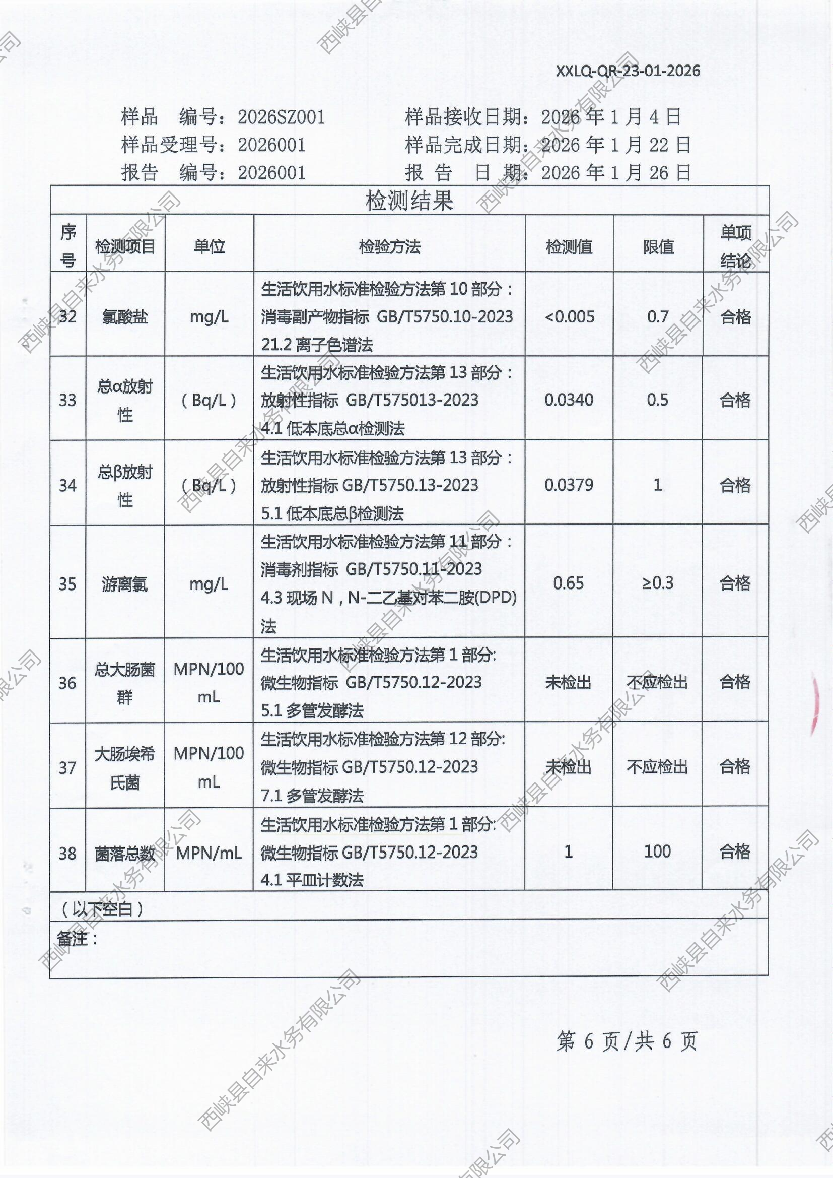 生活饮用水检测报告(出厂水)2026-01